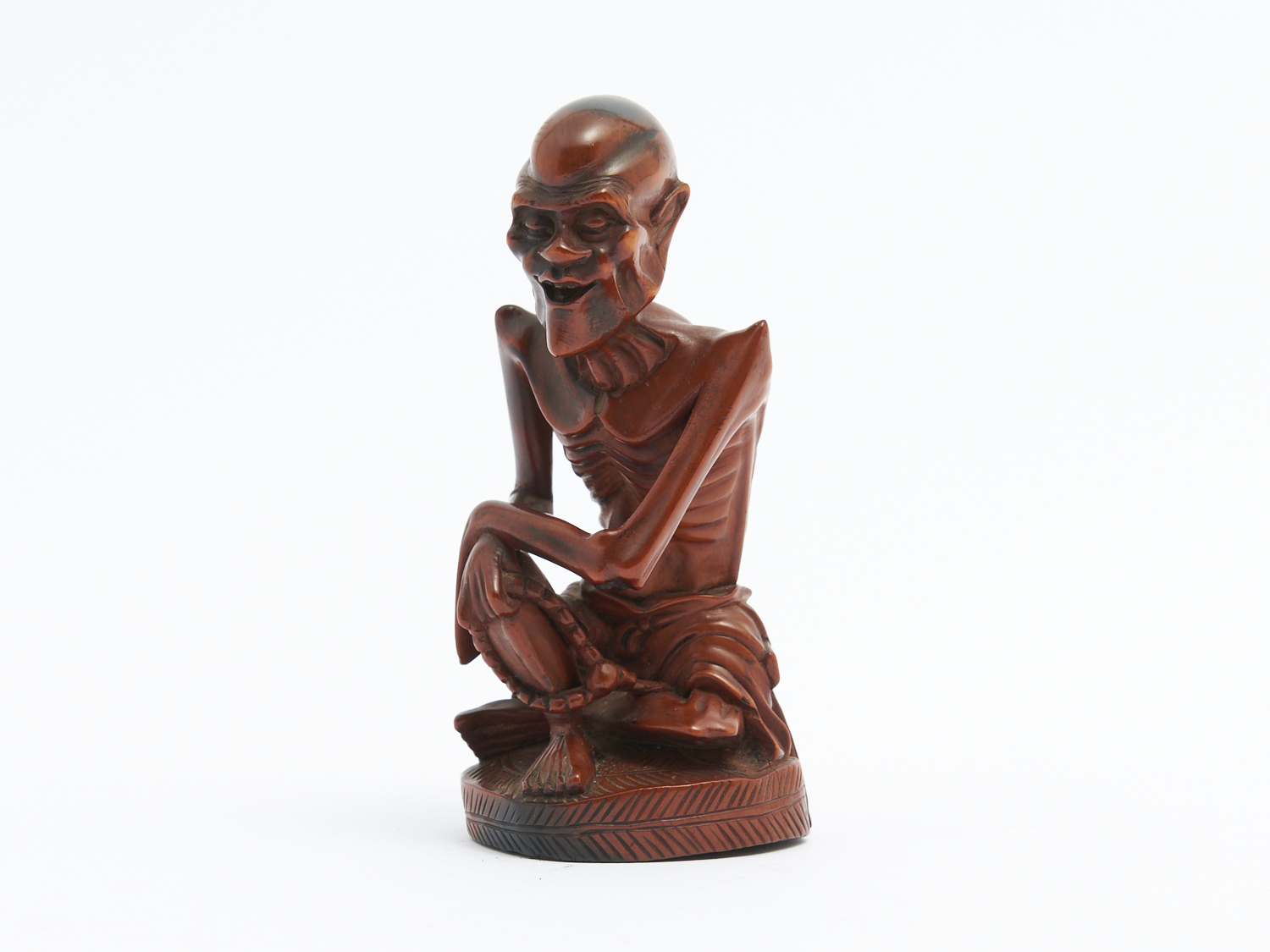 A WOODEN OKIMONO, EMACIATED BUDDHIST WITH ROSARY BEADS H.12.5CM, LEONARD JOEL DELIVERY SIZE: SMALL