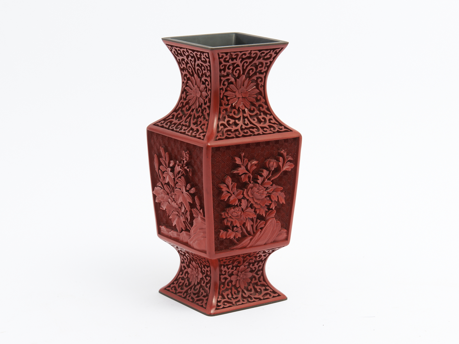 A CHINESE CARVED CINNABAR SQUARE VASE H.23CM, LEONARD JOEL DELIVERY SIZE: MEDIUM