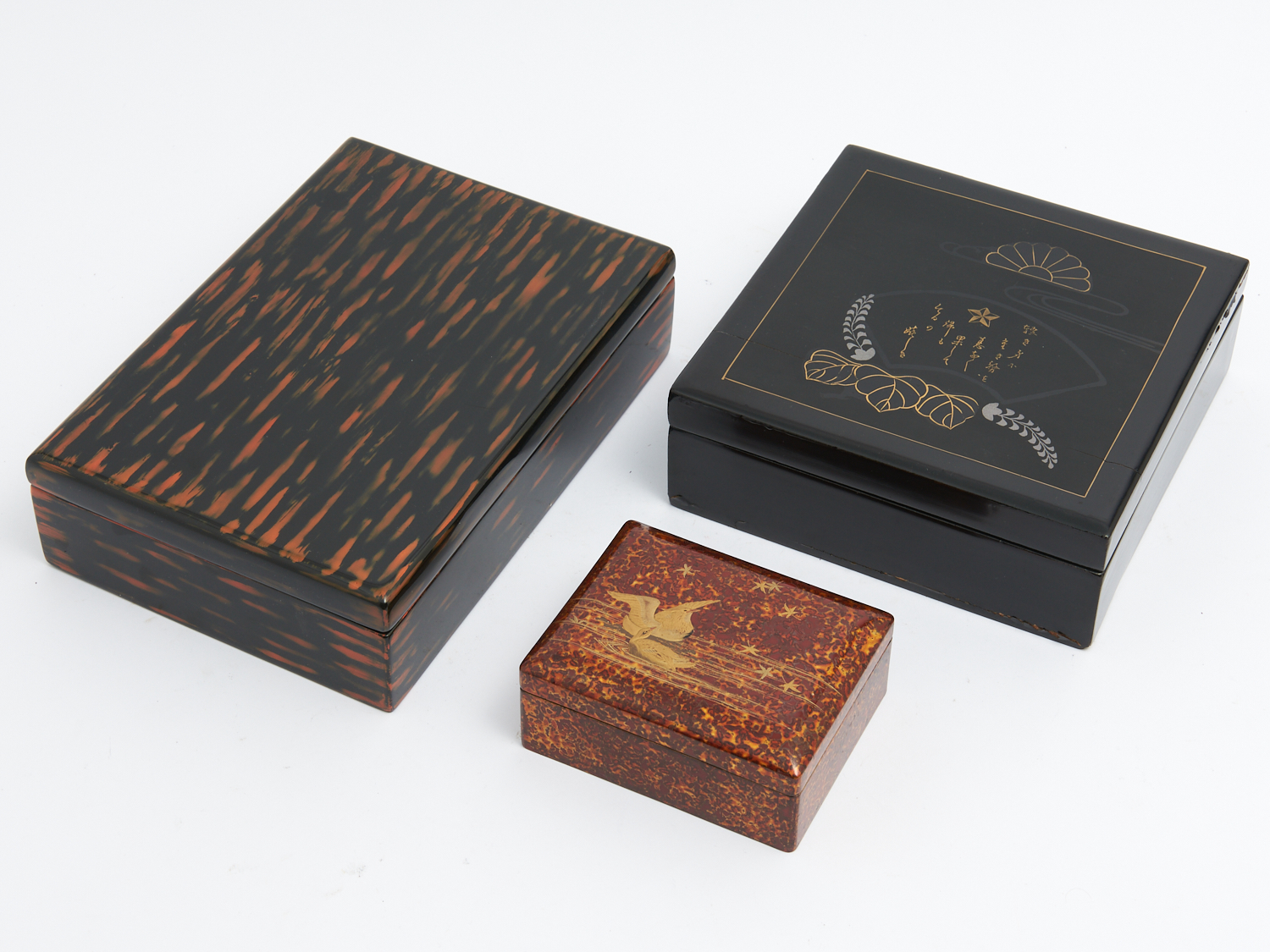 THREE JAPANESE LACQUER BOXES (A/F) 21.5CM (LONGEST) LEONARD JOEL DELIVERY SIZE: MEDIUM