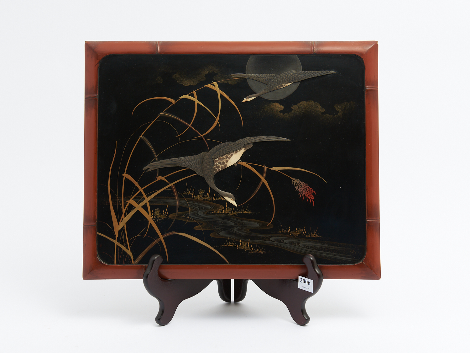 A LACQUER PANEL WITH INSET GEESE FLYING OVER A MOONLIT STREAM 32.5 X 39CM, LEONARD JOEL DELIVERY SIZE: SMALL