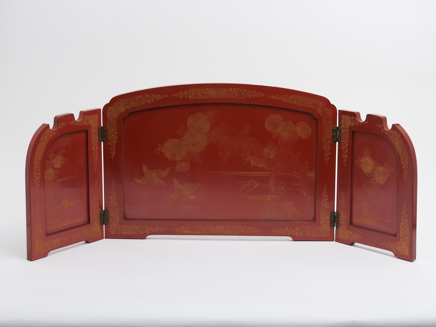 A RED HINGED LACQUER FOLDING TABLE SCREEN H.35CM, LEONARD JOEL DELIVERY SIZE: LARGE