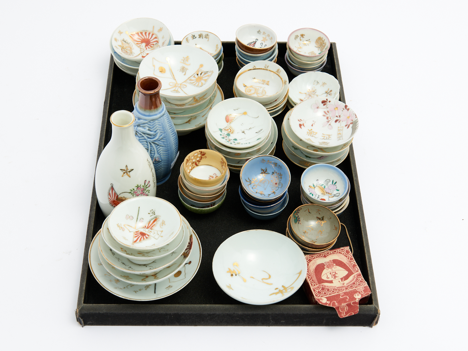 A COLLECTION OF PORCELAIN SAKE CUPS, DISHES AND TOKKURI H.15CM (TALLEST), LEONARD JOEL DELIVERY SIZE: LEONARD JOEL DELIVERY SIZE: X-LARGE
