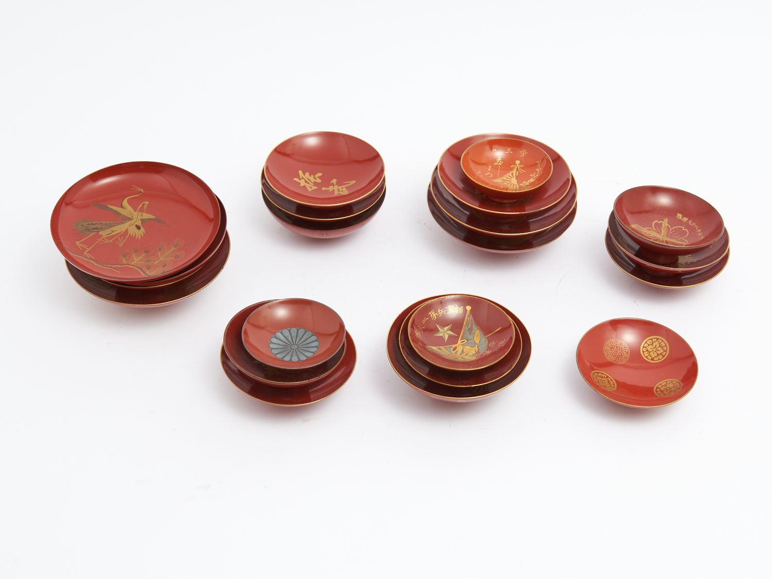 A COLLECTION OF LACQUER SAKE CUPS AND DISHES DIA.13CM (LARGEST), LEONARD JOEL DELIVERY SIZE: MEDIUM