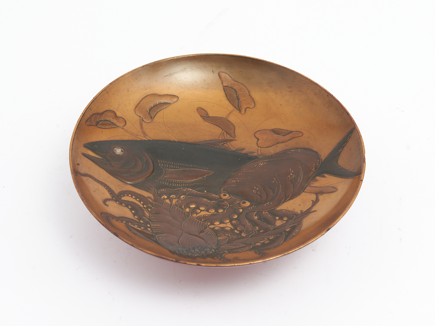 A JAPANESE SATSUMA LACQUER DISH WITH PAINTED FISH, SIGNED, EDO PERIOD DIA.20CM, LEONARD JOEL DELIVERY SIZE: SMALL