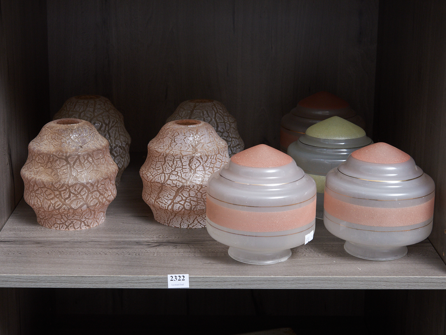 EIGHT MID-CENTURY LIGHT SHADES INCLUDING TWO MATCHING PAIRS, A TRIO AND ONE SIMILAR SHADE DIA.12CM (LARGEST), LEONARD JOEL DELIVERY SIZE: LARGE