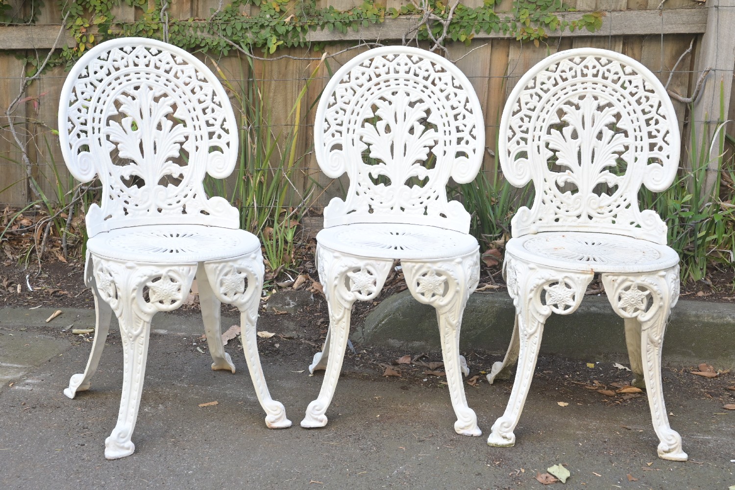 A SET OF THREE CAST IRON OUTDOOR CHAIRS (85H X 40W X 45D CM) (LEONARD JOEL DELIVERY SIZE: X-LARGE)