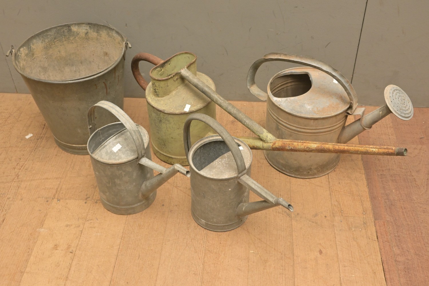 A GROUP OF WATERING CANS AND BUCKET (A/F) (LEONARD JOEL DELIVERY SIZE: LARGE)