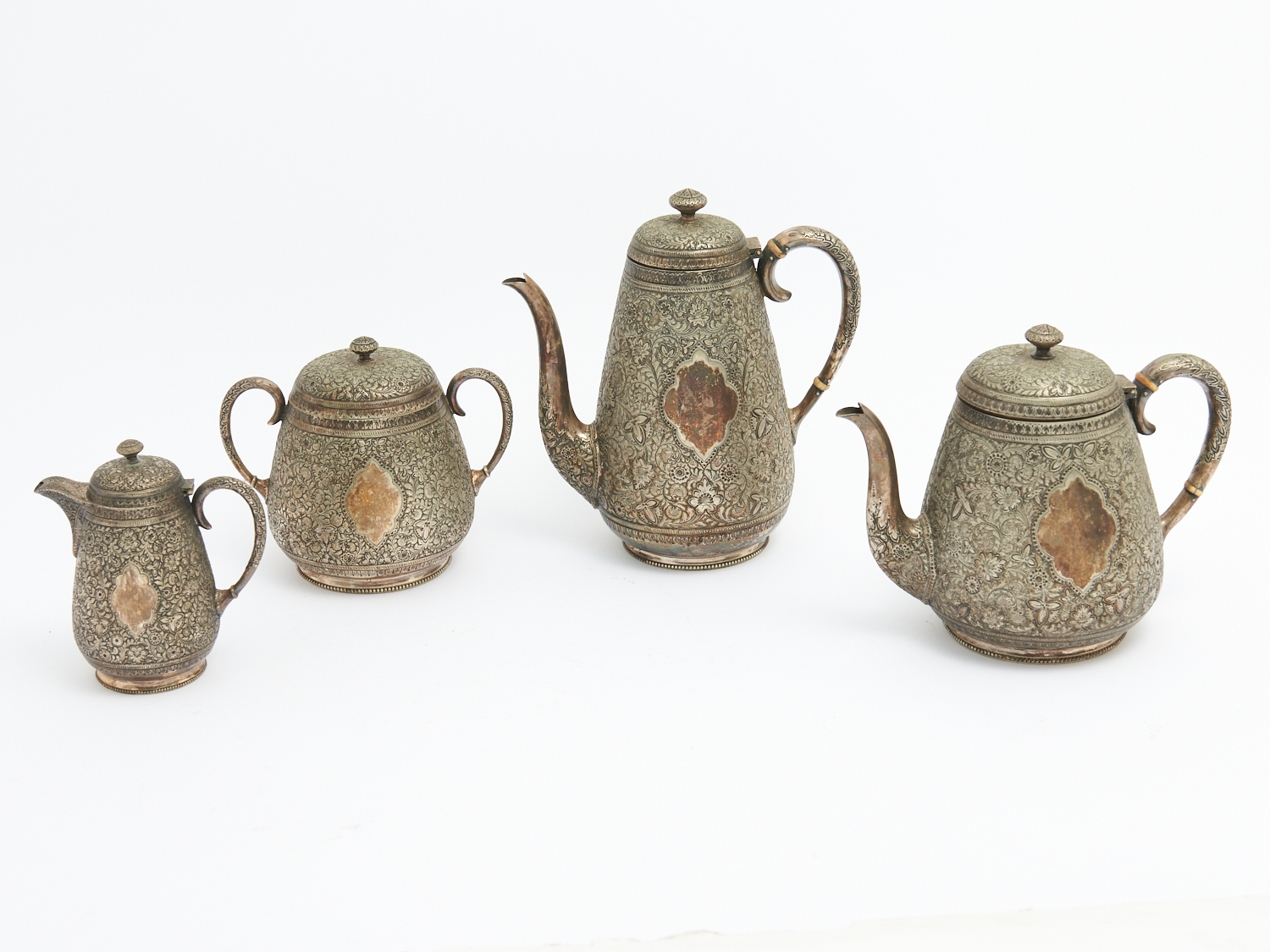 A DECORATIVE INDIAN SILVER PLATE FOUR PIECE TEA AND COFFER SERVICE H.24CM (TALLEST), LEONARD JOEL DELIVERY SIZE: MEDIUM