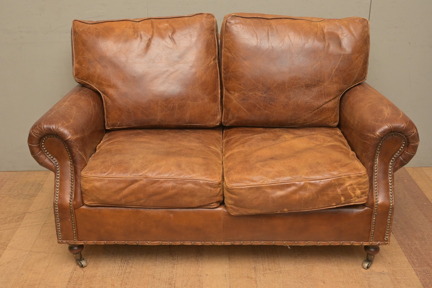 A QUALITY REPRODUCTION BUTTON-BACK TWO SEAT LOUNGE WITH ANTIQUED LEATHER (A/F) (90H X 136W X 89D CM) (PLEASE NOTE THIS HEAVY ITEM MUST BE REMOVED BY CARRIERS AT THE CUSTOMER'S EXPENSE. LEONARD JOEL STAFF CANNOT ASSIST CARRYING THIS ITEM) (X-LARGE ITEM)