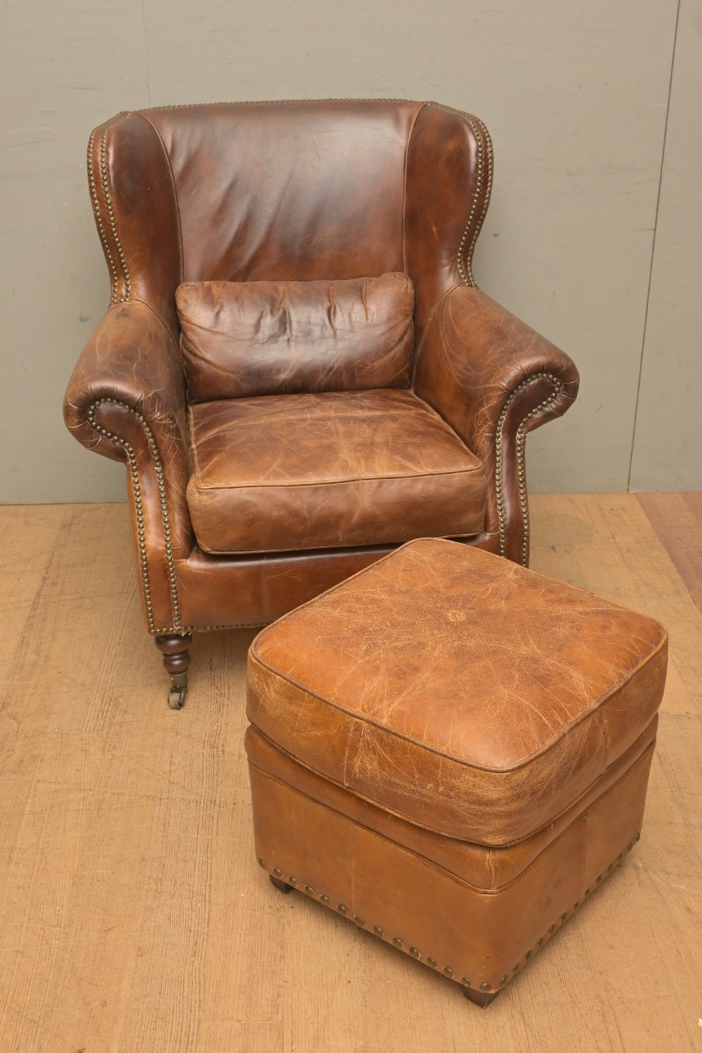 A QUALITY REPRODUCTION ARMCHAIR WITH MATCHED OTTOMAN, BOTH WITH ANTIQUED LEATHER (A/F) (94H X 90W X 82D CM) (PLEASE NOTE THIS HEAVY ITEM MUST BE REMOVED BY CARRIERS AT THE CUSTOMER'S EXPENSE. LEONARD JOEL STAFF CANNOT ASSIST CARRYING THIS ITEM) (X-LARGE ITEM)