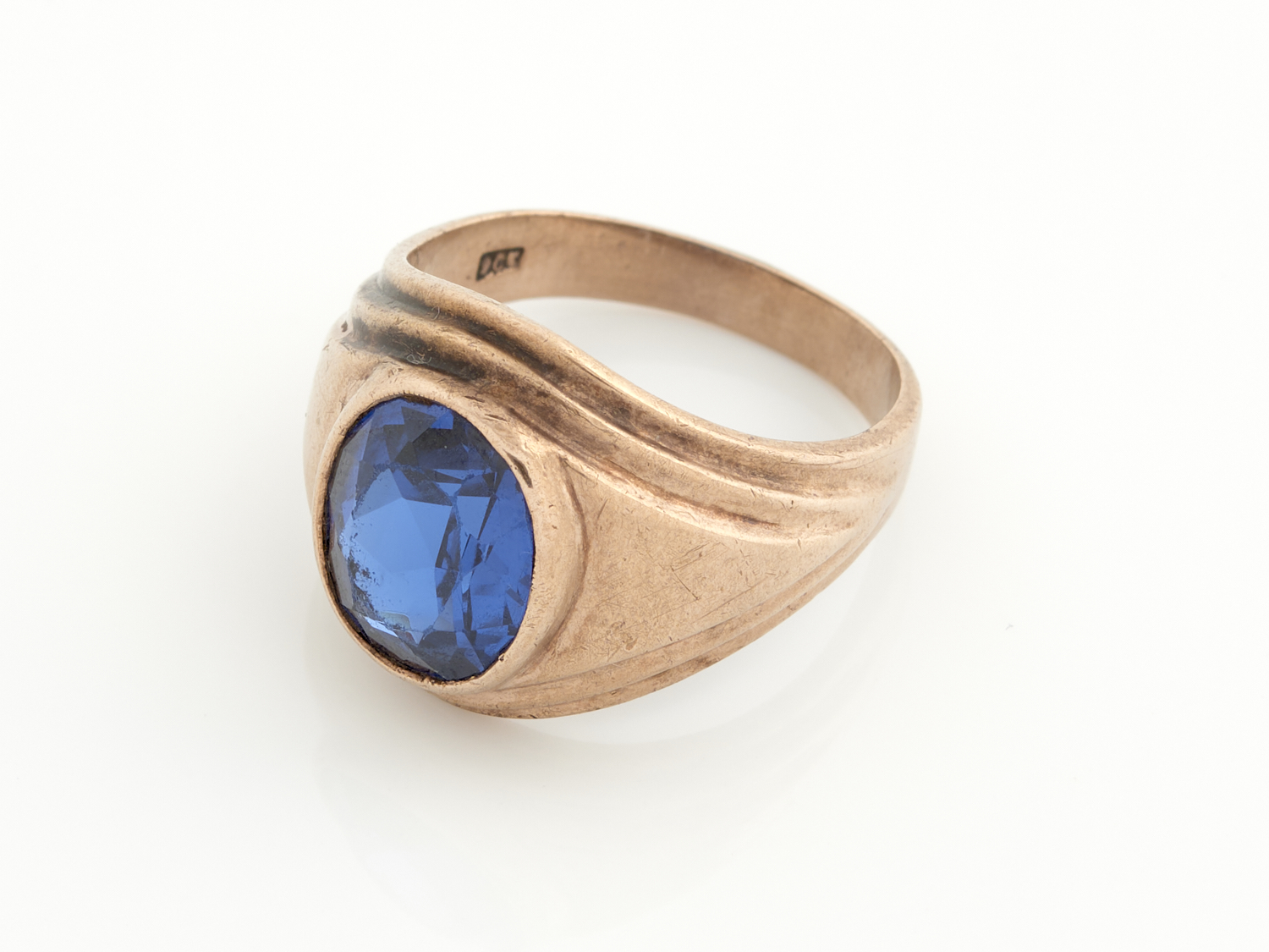 A SYNTHETIC SAPPHIRE RING IN 9CT GOLD, SIZE R, 8.1GMS