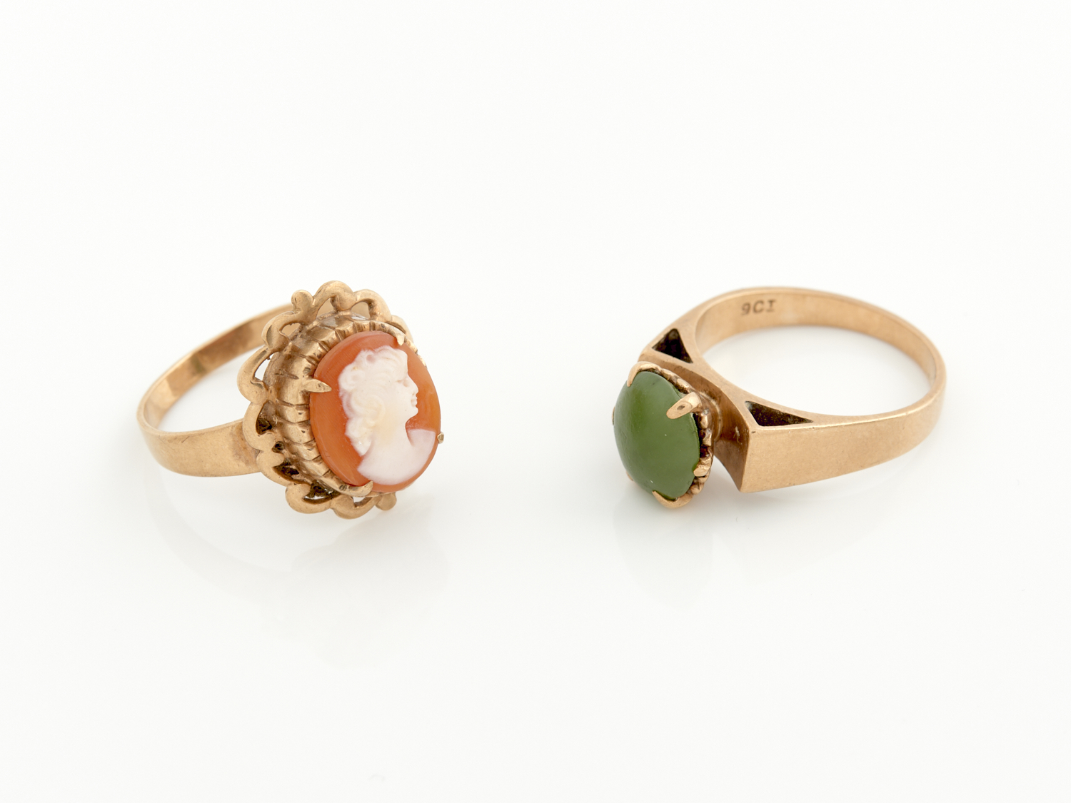 A CAMEO RING STAMPED 9CT GOLD, TOGETHER WITH A GREEN HARDSTONE RING STAMPED 9CT GOLD, SIZES P AND O, TOTAL WEIGHT 9.2GMS