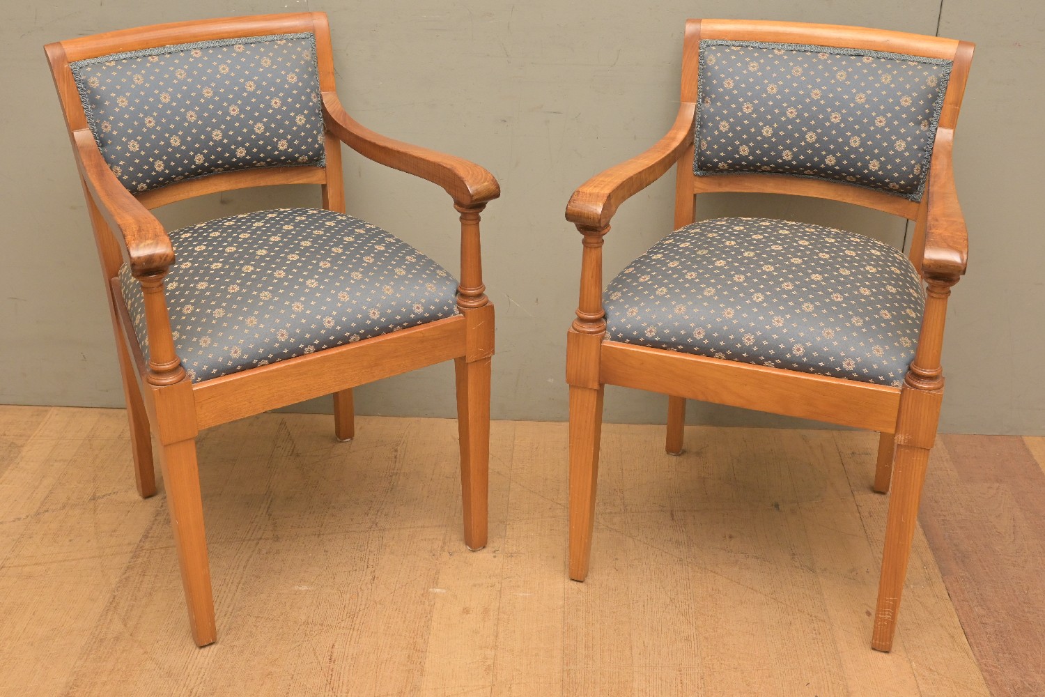 A PAIR OF UPHOLSTERED ARMCHAIRS (A/F) (84H X 55W X 59D CM) (LEONARD JOEL DELIVERY SIZE: LARGE)