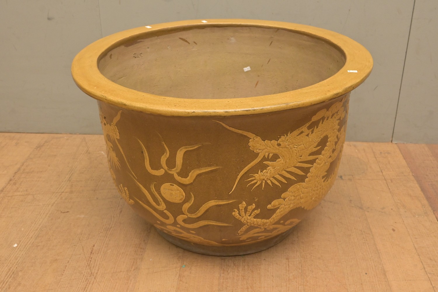 A CHINOISERIE GLAZED POT WITH DRAGON MOTIFS (51H X 79D CM) (PLEASE NOTE THIS HEAVY ITEM MUST BE REMOVED BY CARRIERS AT THE CUSTOMER'S EXPENSE. LEONARD JOEL STAFF CANNOT ASSIST CARRYING THIS ITEM) (X-LARGE ITEM)