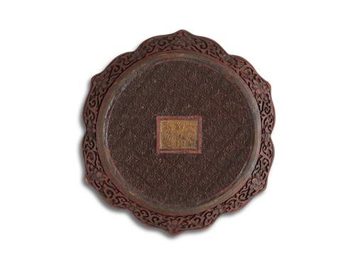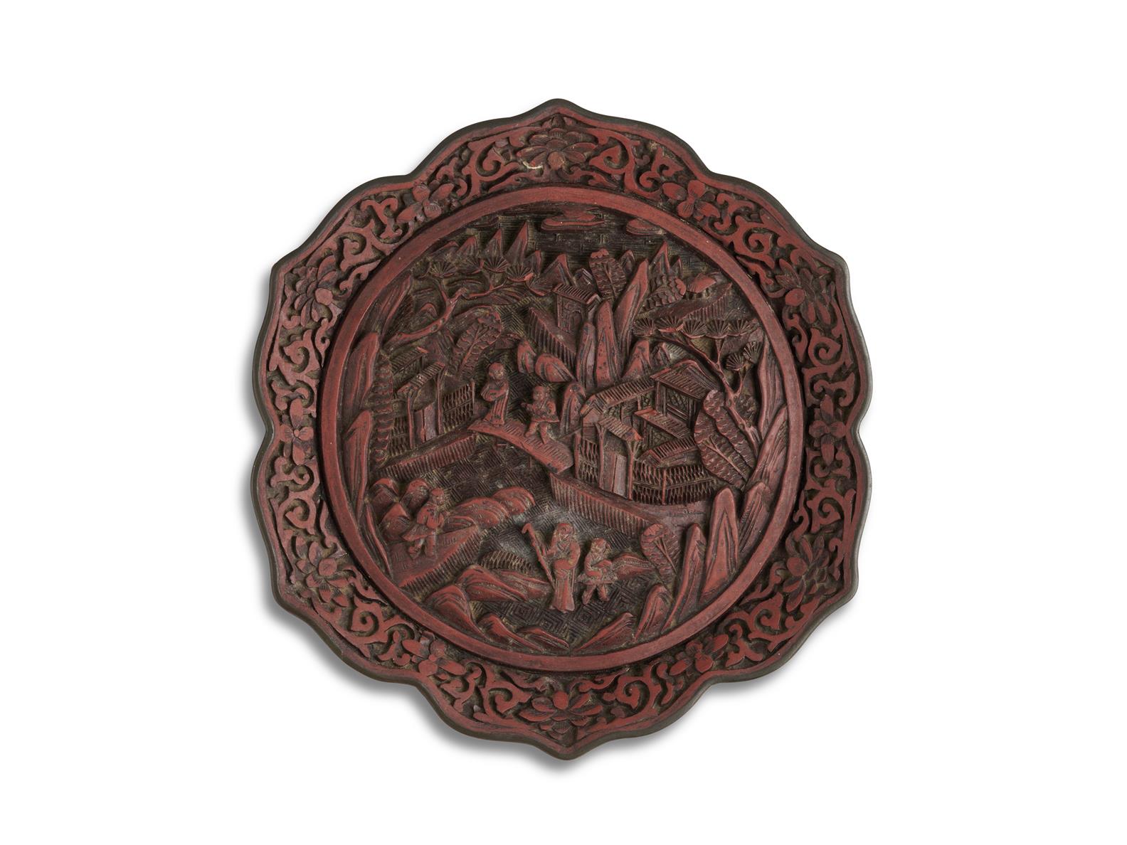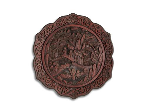 With a barbed foliate rim, deeply carved decoration to the centre of figures in a landscape, and an inset bronze plaque to the reverse with a Qianlong mark.