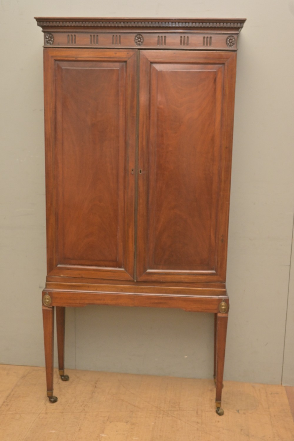 A GEORGIAN TWO PIECE STORAGE CABINET WITH FRUITWOOD STRING INLAY (A/F) (178H X 88W X 31D CM) (PLEASE NOTE THIS HEAVY ITEM MUST BE REMOVED BY CARRIERS AT THE CUSTOMER'S EXPENSE. LEONARD JOEL STAFF CANNOT ASSIST CARRYING THIS ITEM) (X-LARGE ITEM)