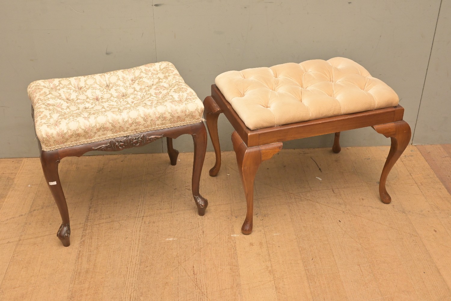 A PAIR OF ANTIQUE STYLE UPHOLSTERED FOOTSTOOLS (A/F) (47H X 59W X 40D CM) (LEONARD JOEL DELIVERY SIZE: LARGE)