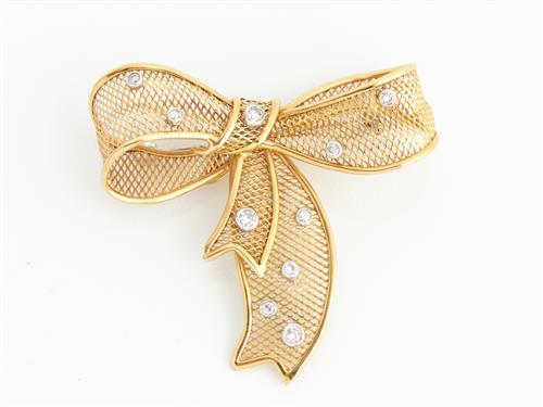 A DIAMOND SET MESH BOW BROOCH IN 18CT GOLD TO A CLASP IN 18CT WHITE GOLD, 45 X 45MM, 5.8GMS