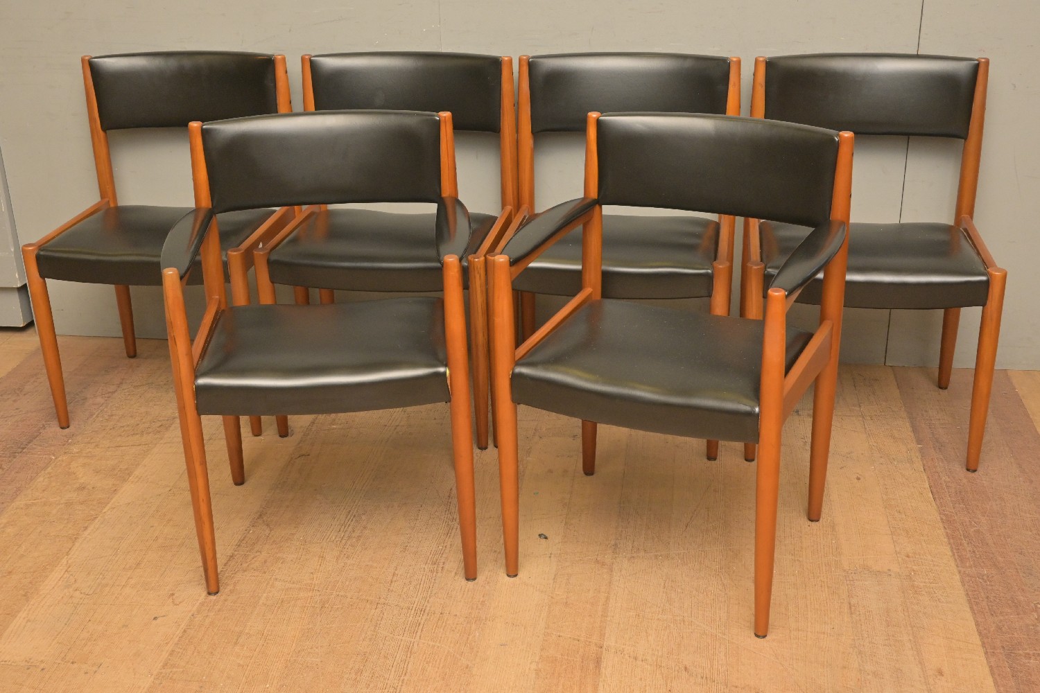 A SET OF SIX 1970'S DINING CHAIRS INCLUDING TWO CARVERS (80H X 56W X 54D CM) (LEONARD JOEL DELIVERY SIZE: X-LARGE)