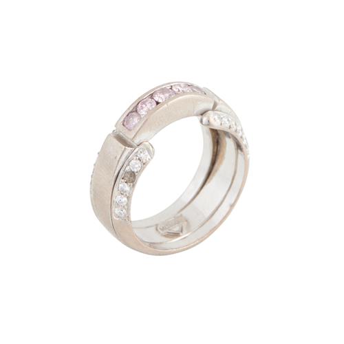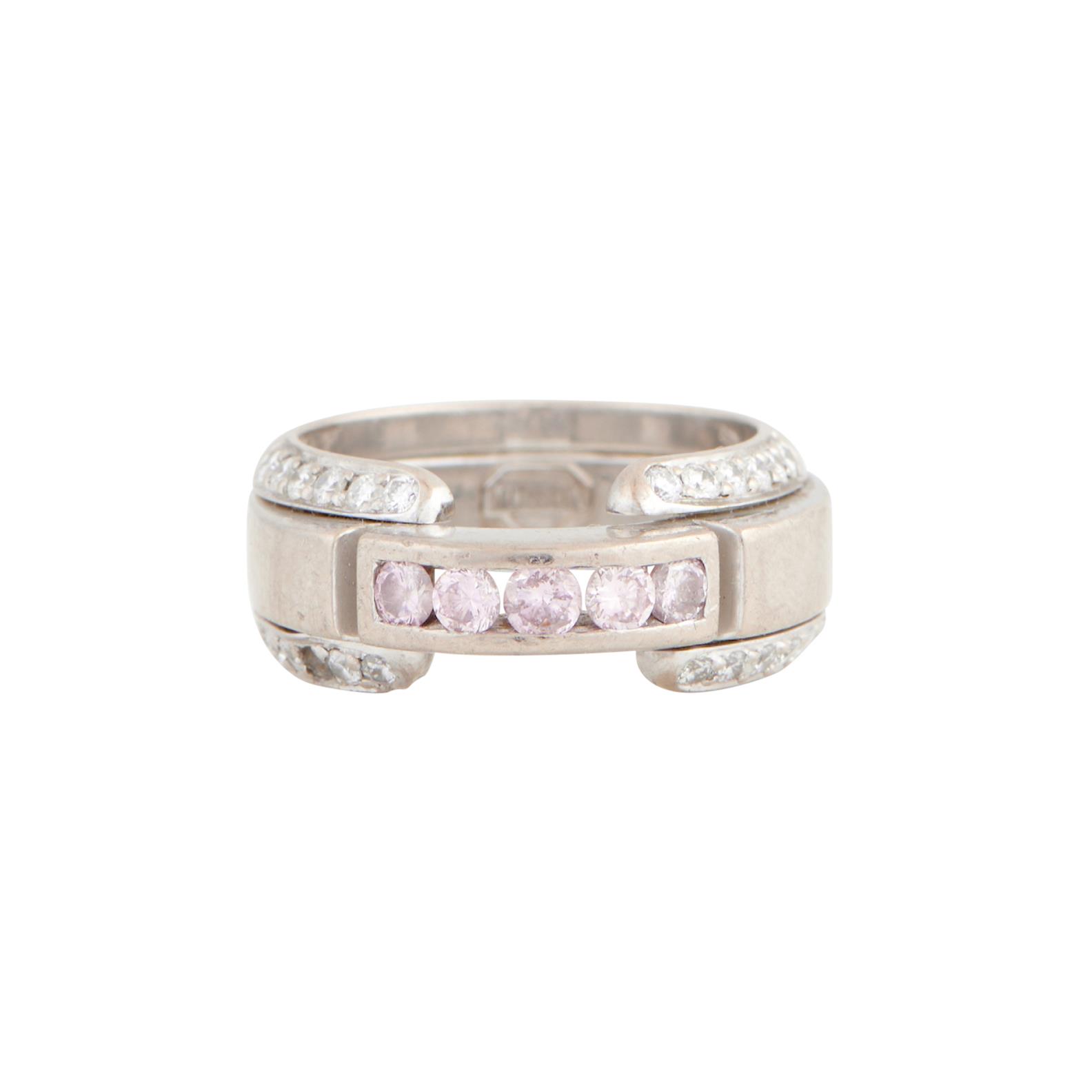 Centring five channel-set brilliant-cut pink diamonds, to shoulders details with brilliant-cut diamonds, one diamond deficient, signed Musson, size N-O, weight 12.2 grams.