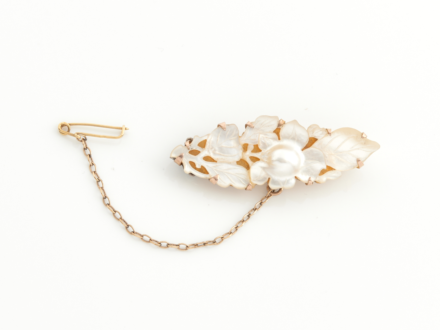 A CARVED BLISTER PEARL BROOCH IN 9CT GOLD, 45 x 15MM, 5.9GMS