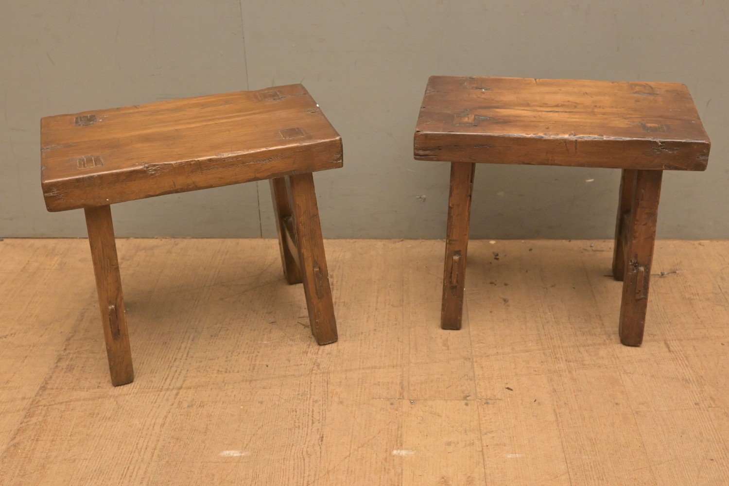 A PAIR OF FRENCH STYLE OAK MILKING STOOLS (35H X 40W X 24D CM) (LEONARD JOEL DELIVERY SIZE: LARGE)