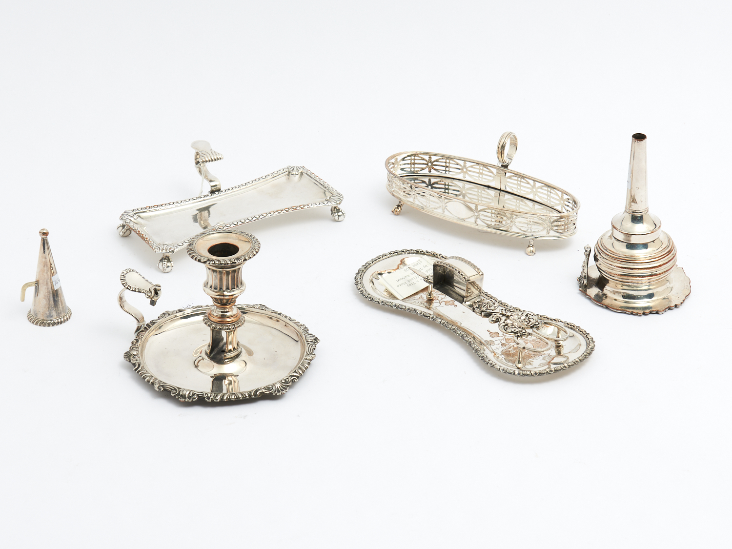 A COLLECTION OF 18TH AND 19TH CENTURY SILVER PLATE INCLUDING A WINE FUNNEL, CHAMBER STICK, SNUFFER AND TRAY, AND TWO OTHER TRAYS H.15CM (TALLEST), LEONARD JOEL DELIVERY SIZE: MEDIUM
