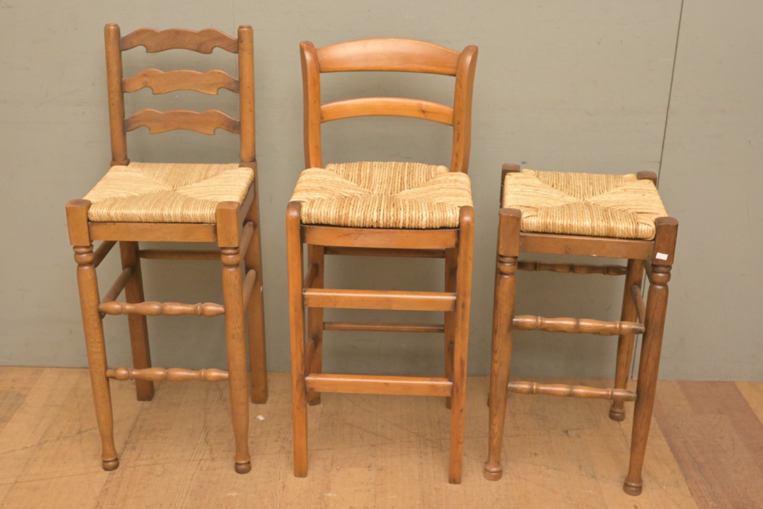 A HARLEQUIN SET OF THREE RUSH SEATED BARSTOOLS (98H X 42W X 40D CM) (LEONARD JOEL DELIVERY SIZE: X-LARGE)