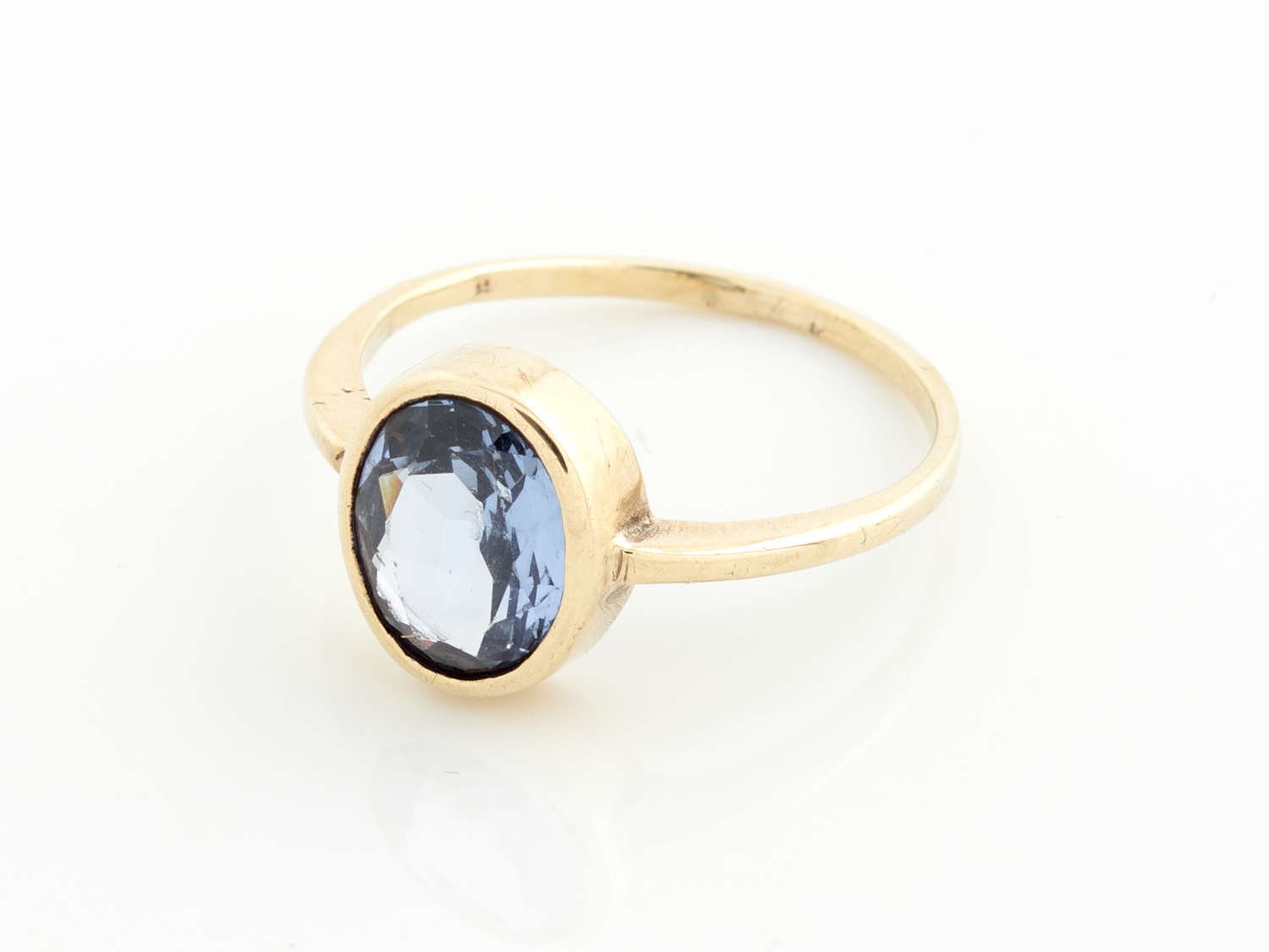A SYNTHETIC SPINEL RING IN 9CT GOLD, SIZE O, 2.3GMS