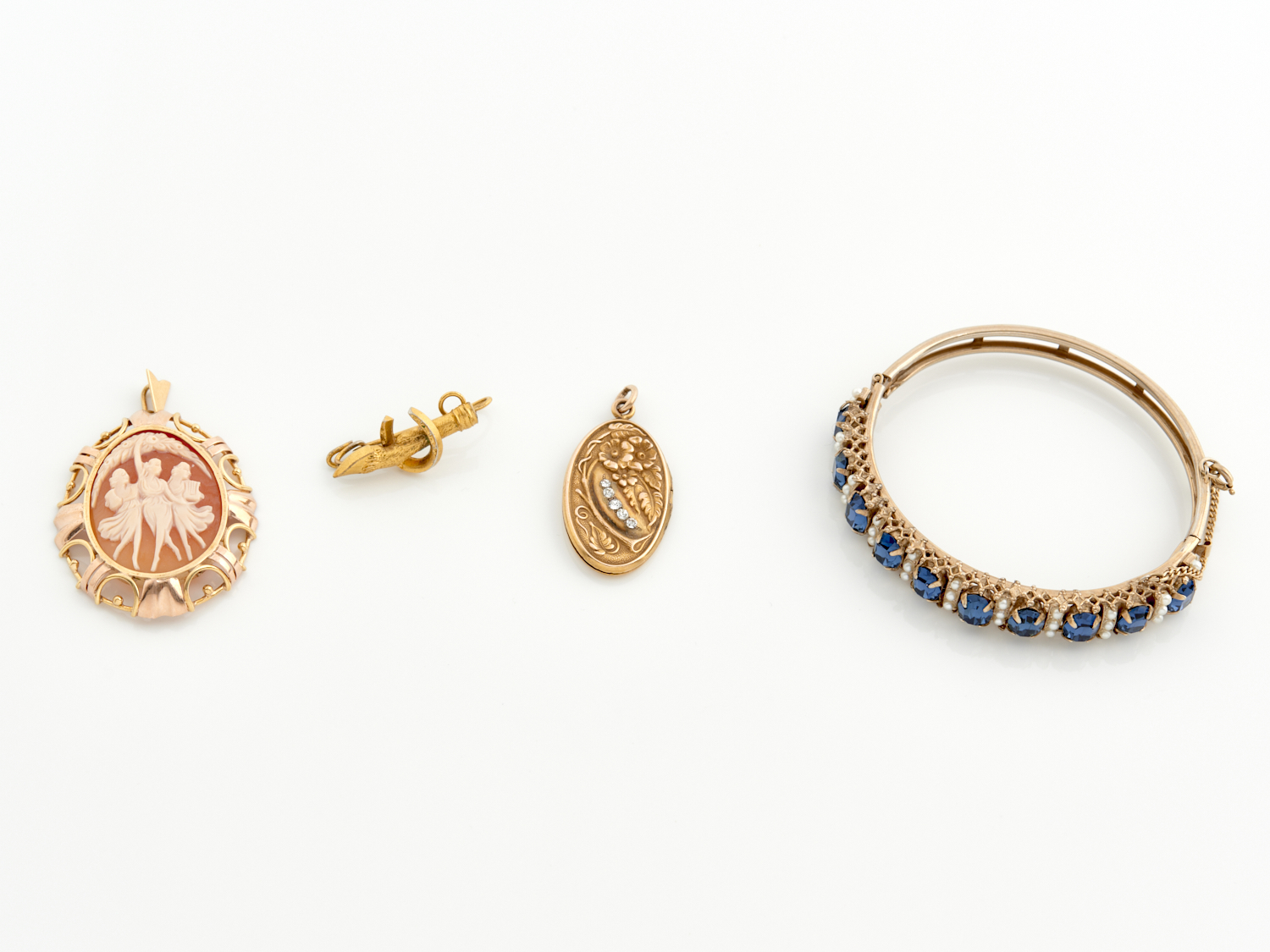 A COLLECTION OF VINTAGE JEWELLERY IN GOLD PLATE, INCLUDING A CAMEO BROOCH AND AN ART NOUVEAU LOCKET IN GOLD PLATE, THE HINGE BANGLE INTERNAL MEASURMENTS 60MM