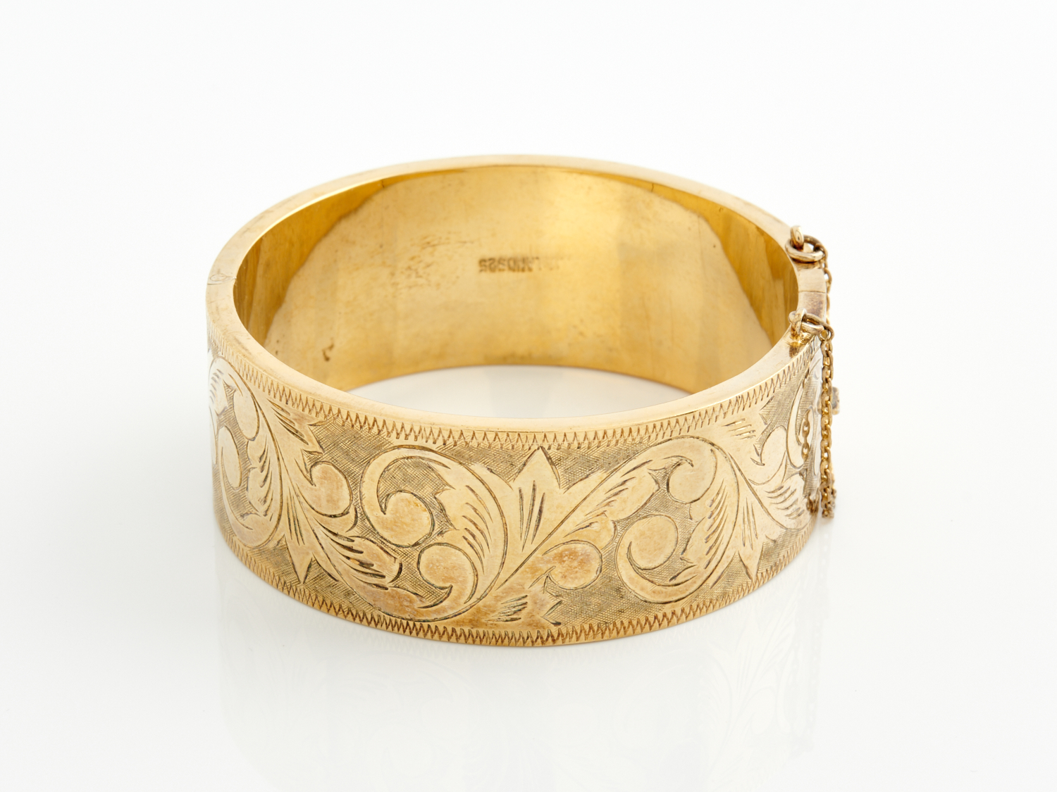 A VINTAGE ENGRAVED HINGE BANGLE IN SILVER GILT, INNER DIAMETER 61MM