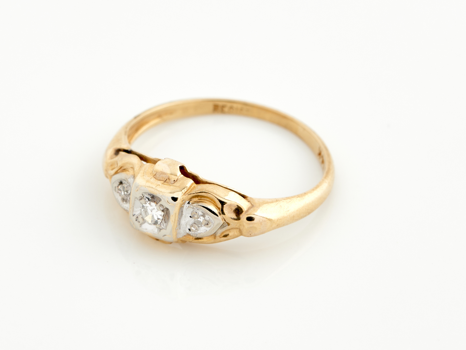 A VINTAGE THREE STONE DIAMOND RING IN 14CT GOLD, SIZE L, 1.3GMS