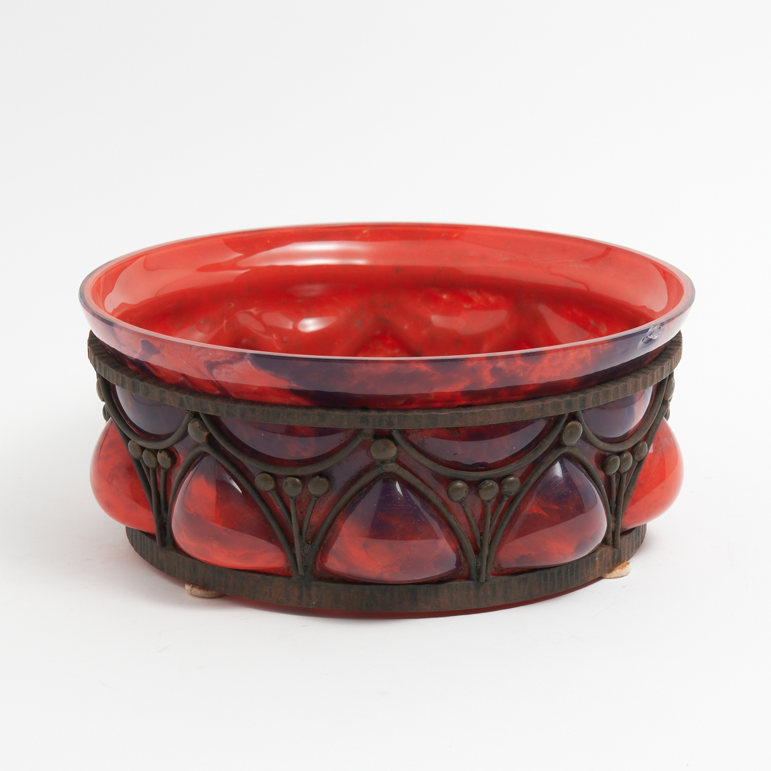 The mottled red and purple glass within an openwork iron frame, paper label for L. PERRIER (retailer) to base.