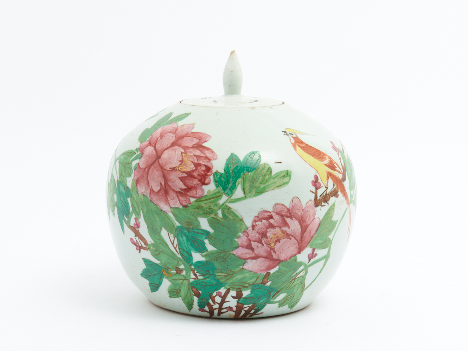 AN ANTIQUE CHINESE GINGER JAR WITH HAND PAINTED BIRD AND FOLIAGE DECORATION H.22CM (SMALL CHIPS), LEONARD JOEL DELIVERY SIZE: MEDIUM
