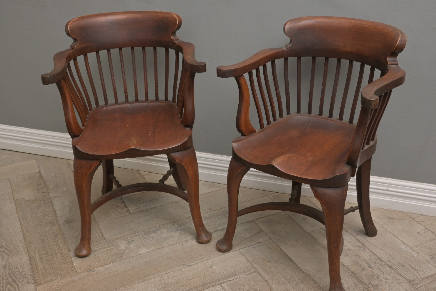 A PAIR OF ANTIQUE CAPTAIN'S CHAIRS - SIGNS OF REPAIR (A/F) (83H X 58W X 57D CM) (LEONARD JOEL DELIVERY SIZE: LARGE)
