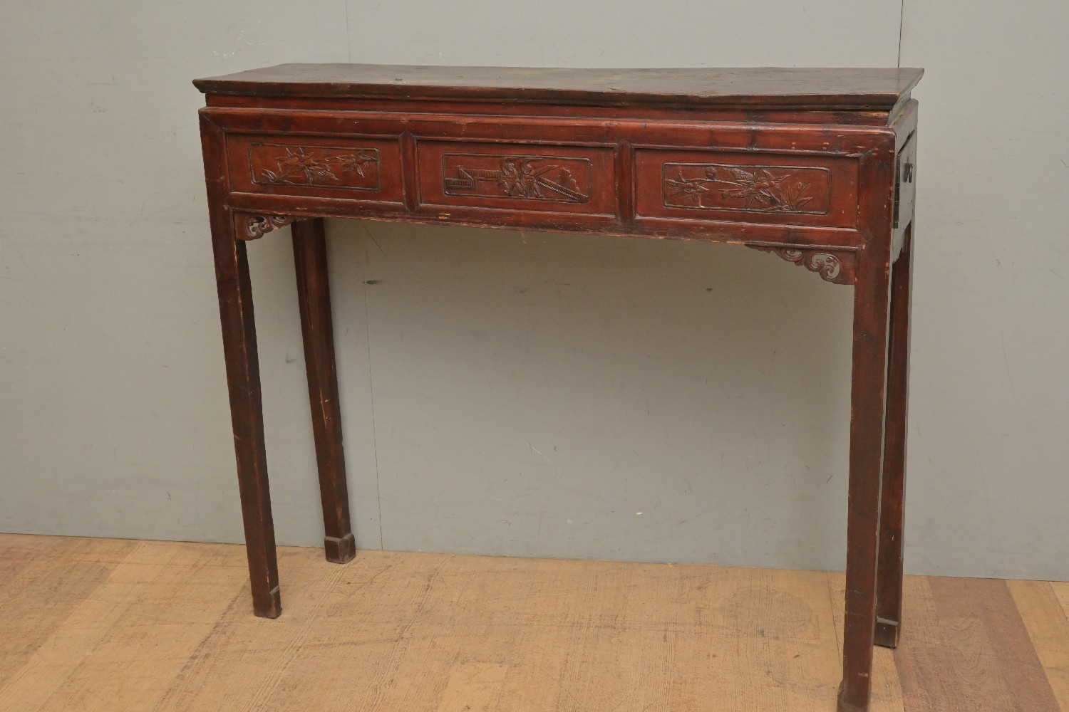 A CHINESE SIDE TABLE, WITH A PANELLED AND CARVED FRONT AND A DRAWER TO EACH SIDE (A/F) (113H X 128W X 34D CM) (LEONARD JOEL DELIVERY SIZE: X-LARGE)