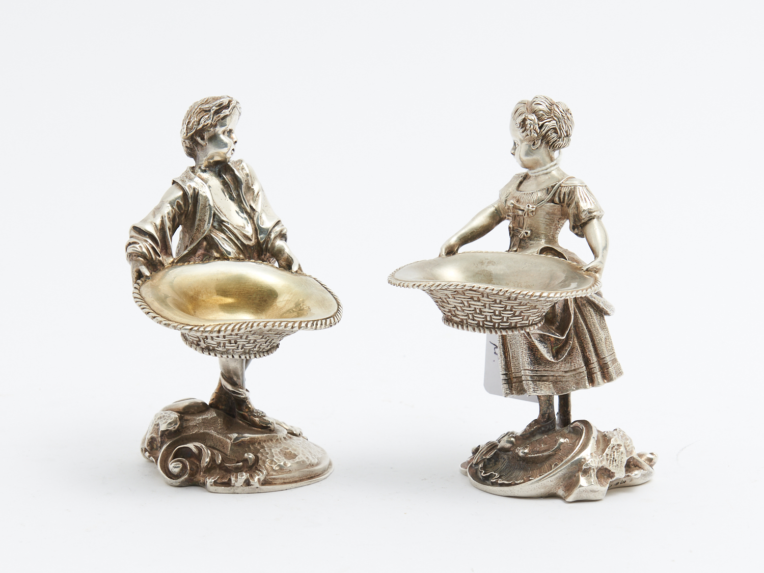 A PAIR OF SILVER PLATE FIGURAL SALT CELLARS H.15CM, LEONARD JOEL DELIVERY SIZE: SMALL