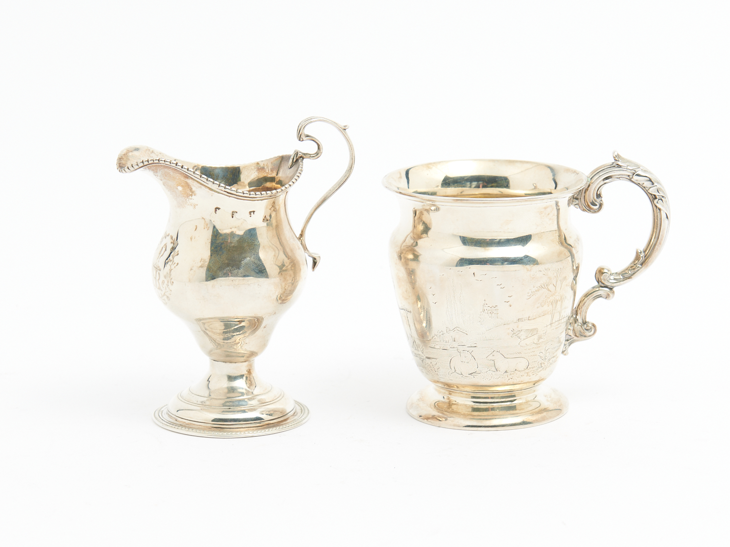A STERLING SILVER FOOTED JUG AND A STERLING SILVER PICTORIAL MUG WITH RURAL SCENE 256G H.11CM (TALLEST), LEONARD JOEL DELIVERY SIZE: SMALL