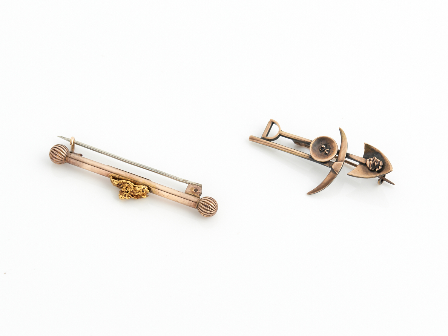 A MINER'S BROOCH IN STAMPED 9CT GOLD, TOGETHER WITH A GOLD NUGGET BROOCH IN STAMPED 18CT GOLD, TOTAL WEIGHT 7.0GMS