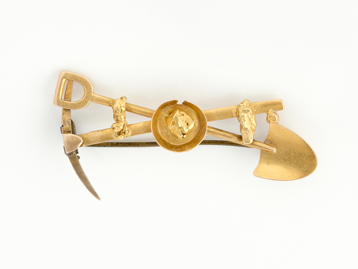A MINER'S BROOCH IN 18CT GOLD, SIGNED