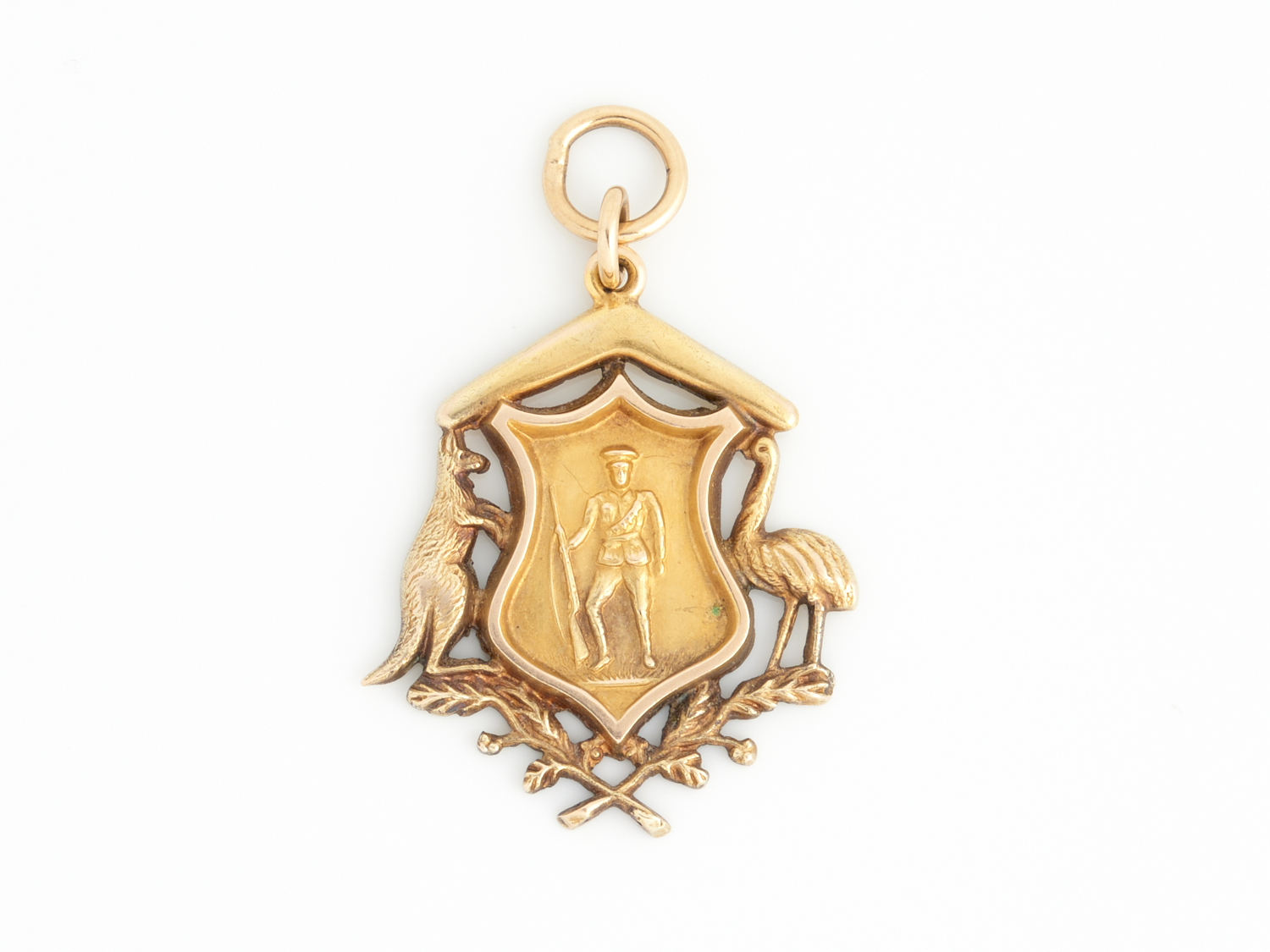 AN AUSTRALIAN COAT OF ARMS MEDALLION IN 9CT GOLD AND 18CT GOLD PLATE, CIRCA 1919, 40 X 35MM, 10.5GMS