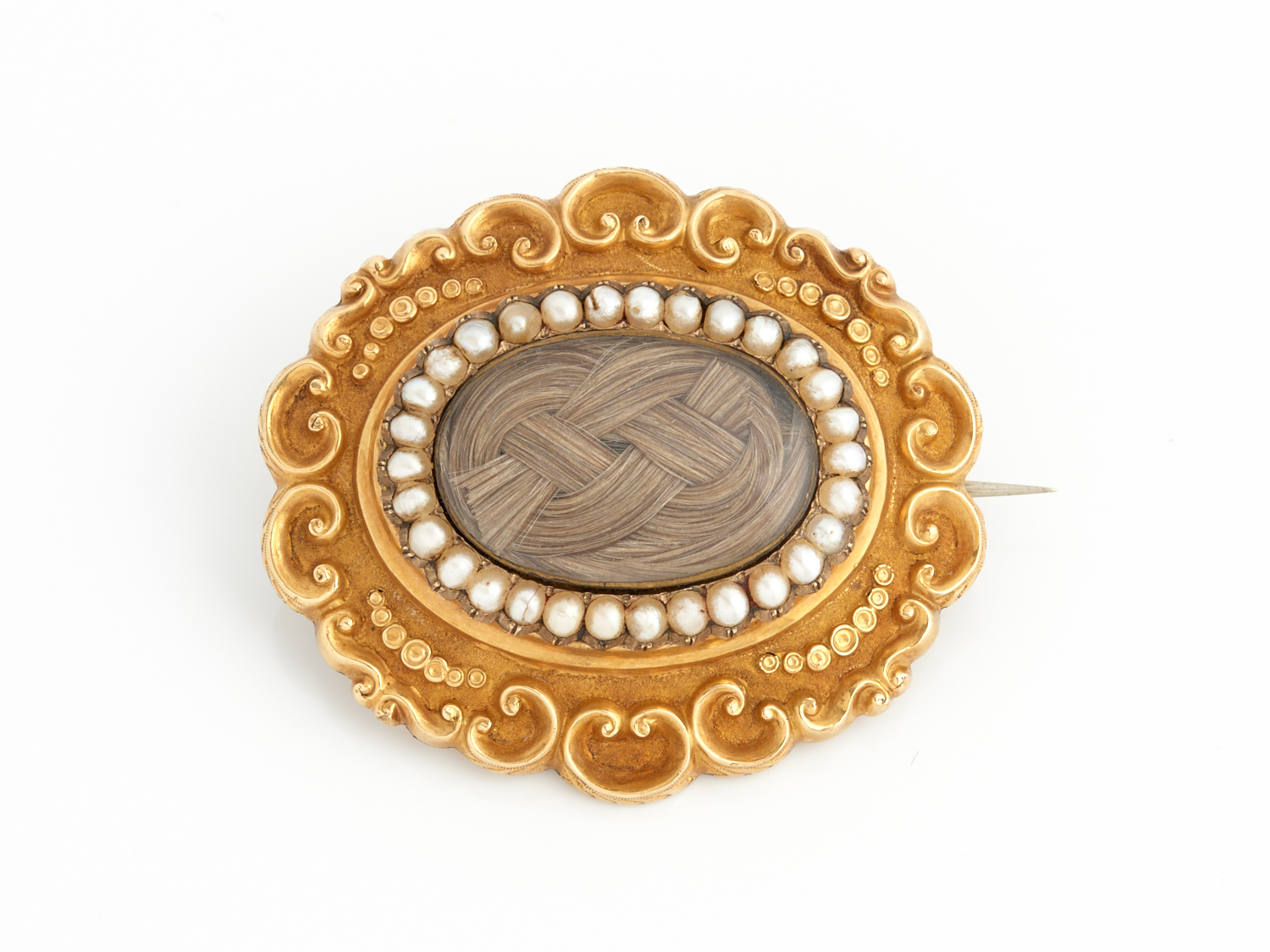 A SEED PEARL SET MOURNING BROOCH IN 9CT GOLD AND GOLD PLATE, 43 X 50MM, 21.4GMS