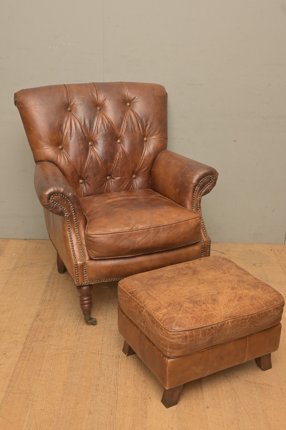 A LEATHER DIAMOND BUTTON-BACK ARMCHAIR WITH MATCHING OTTOMAN (99H X 85W X 87D CM) (LEONARD JOEL DELIVERY SIZE: X-LARGE)