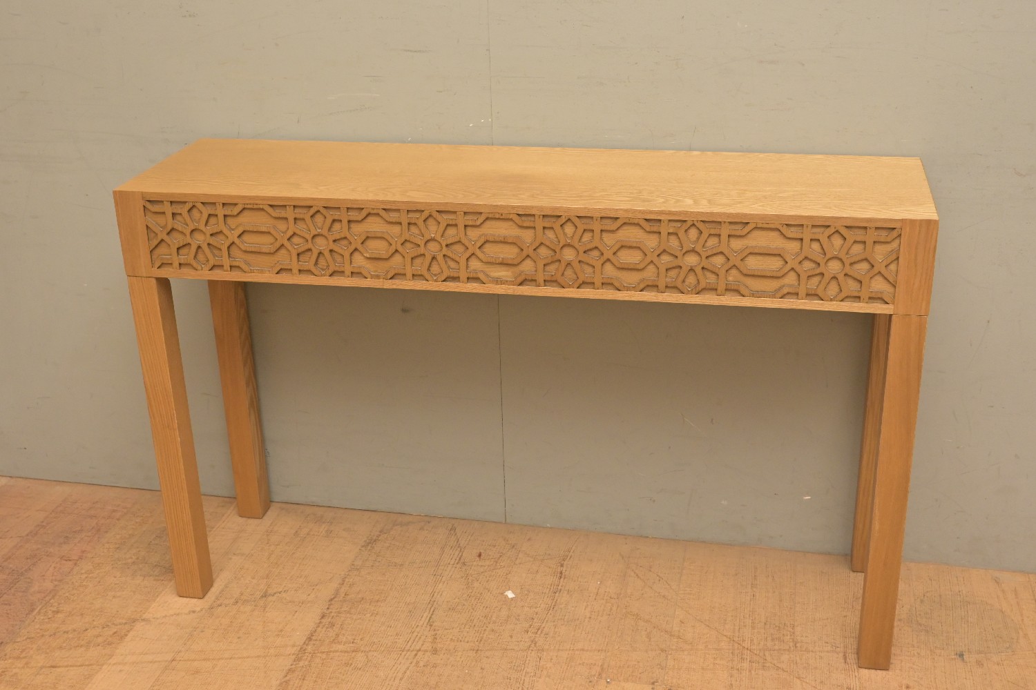AN ELM HALL TABLE WITH A BLIND FRETWORK FREIZE (80H X 130W X 34D CM) (LEONARD JOEL DELIVERY SIZE: X-LARGE)