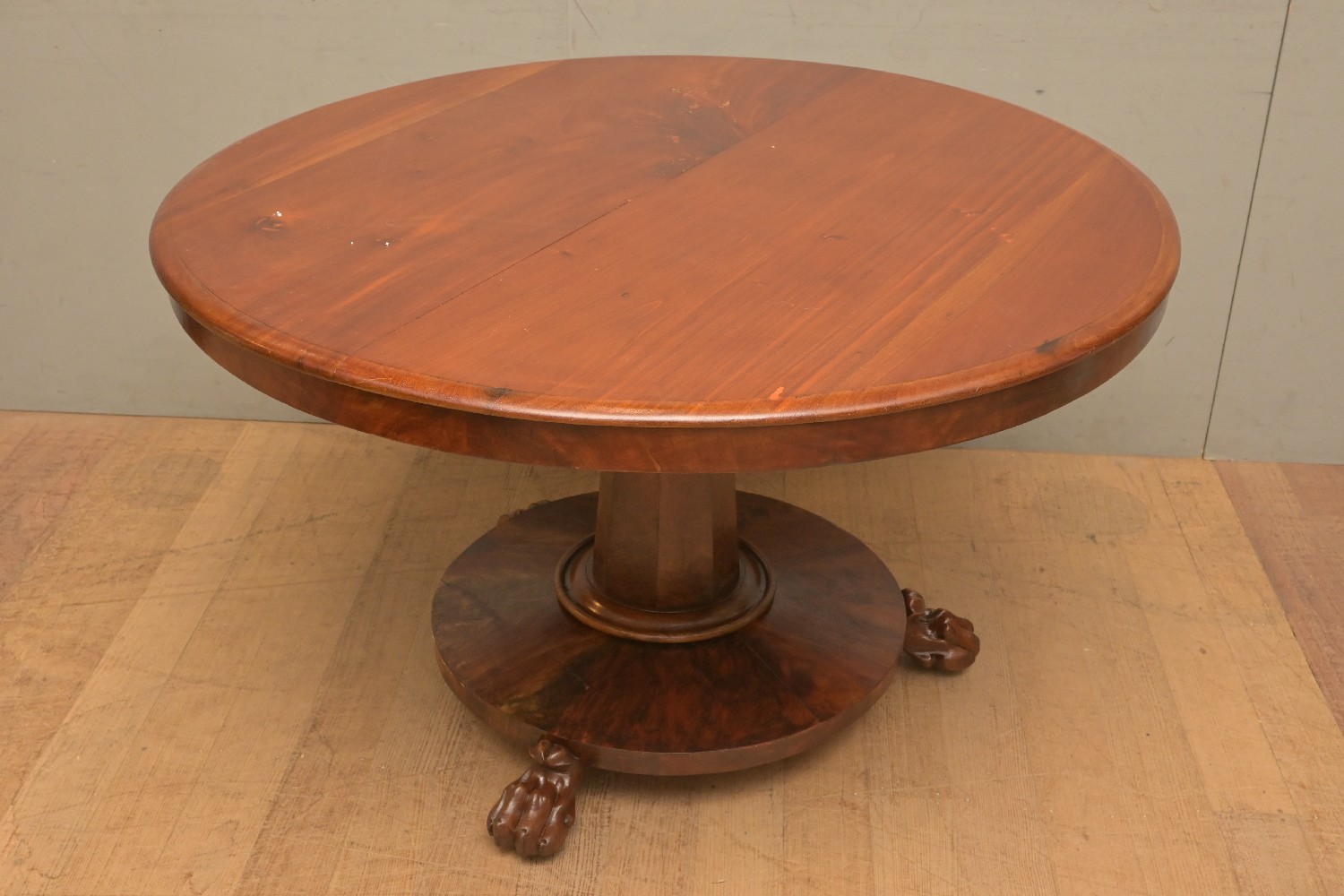A BREAKFAST TABLE WITH 19TH CENTURY MAHOGANY BASE AND LATER TABLE TOP (A/F) (73H X 120D CM) (PLEASE NOTE THIS HEAVY ITEM MUST BE REMOVED BY CARRIERS AT THE CUSTOMER'S EXPENSE. LEONARD JOEL STAFF CANNOT ASSIST CARRYING THIS ITEM) (X-LARGE ITEM)
