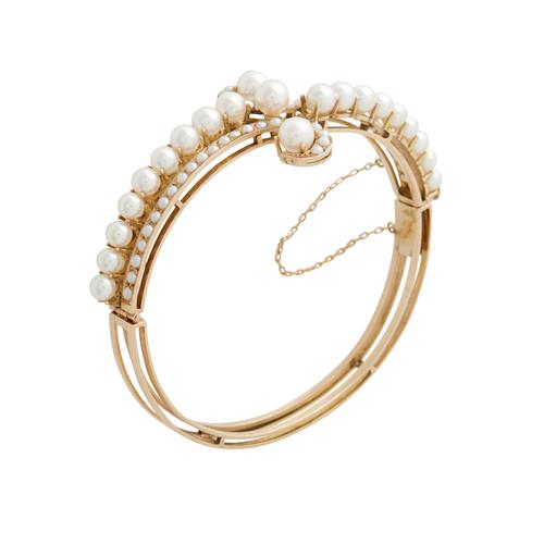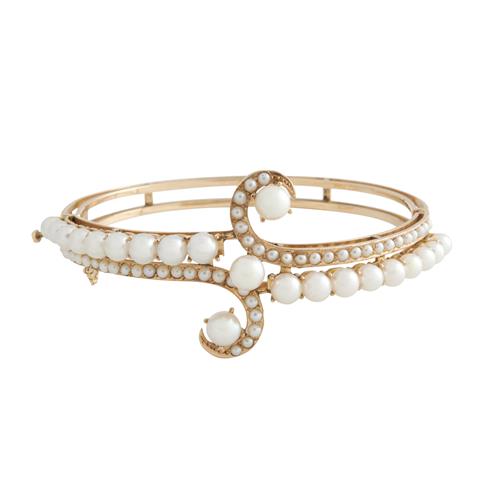 The oval hinged bangle, the top with scroll design set throughout with cultured and seed pearls, inner circumference 170mm, gross weight 19.2 grams.
