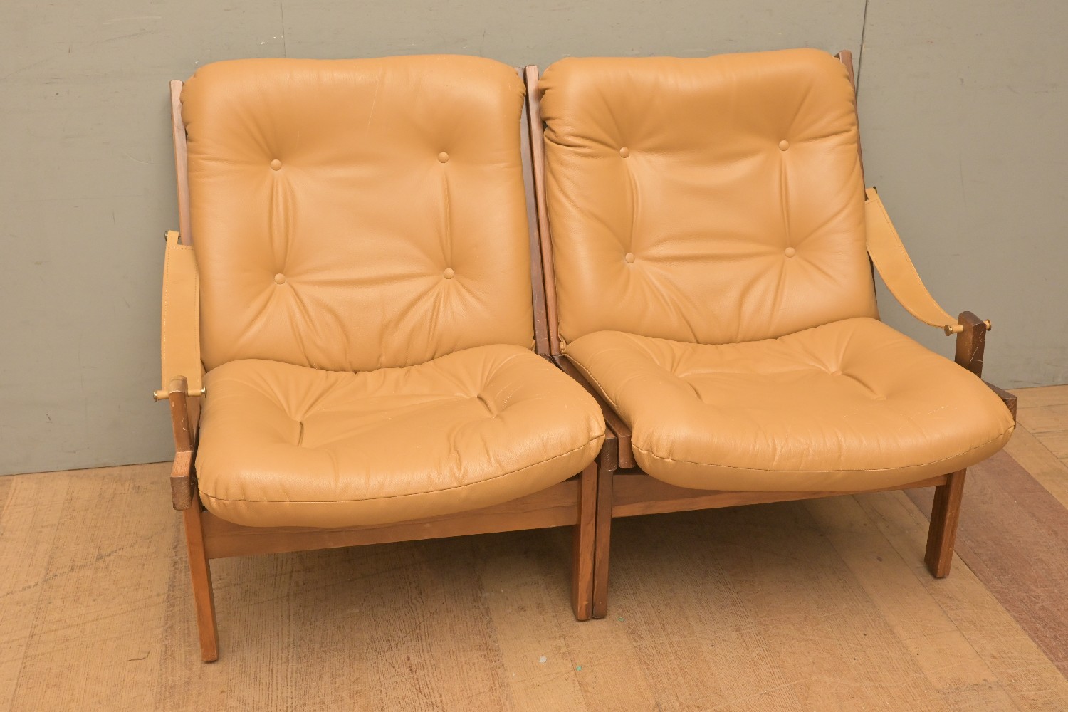 A MID-CENTURY MODULAR LOUNGE SETTING WITH SLING ARMS AND BEIGE LEATHER UPHOLSTERY (A/F) (85H X 132W X 84D CM) (LEONARD JOEL DELIVERY SIZE: X-LARGE)