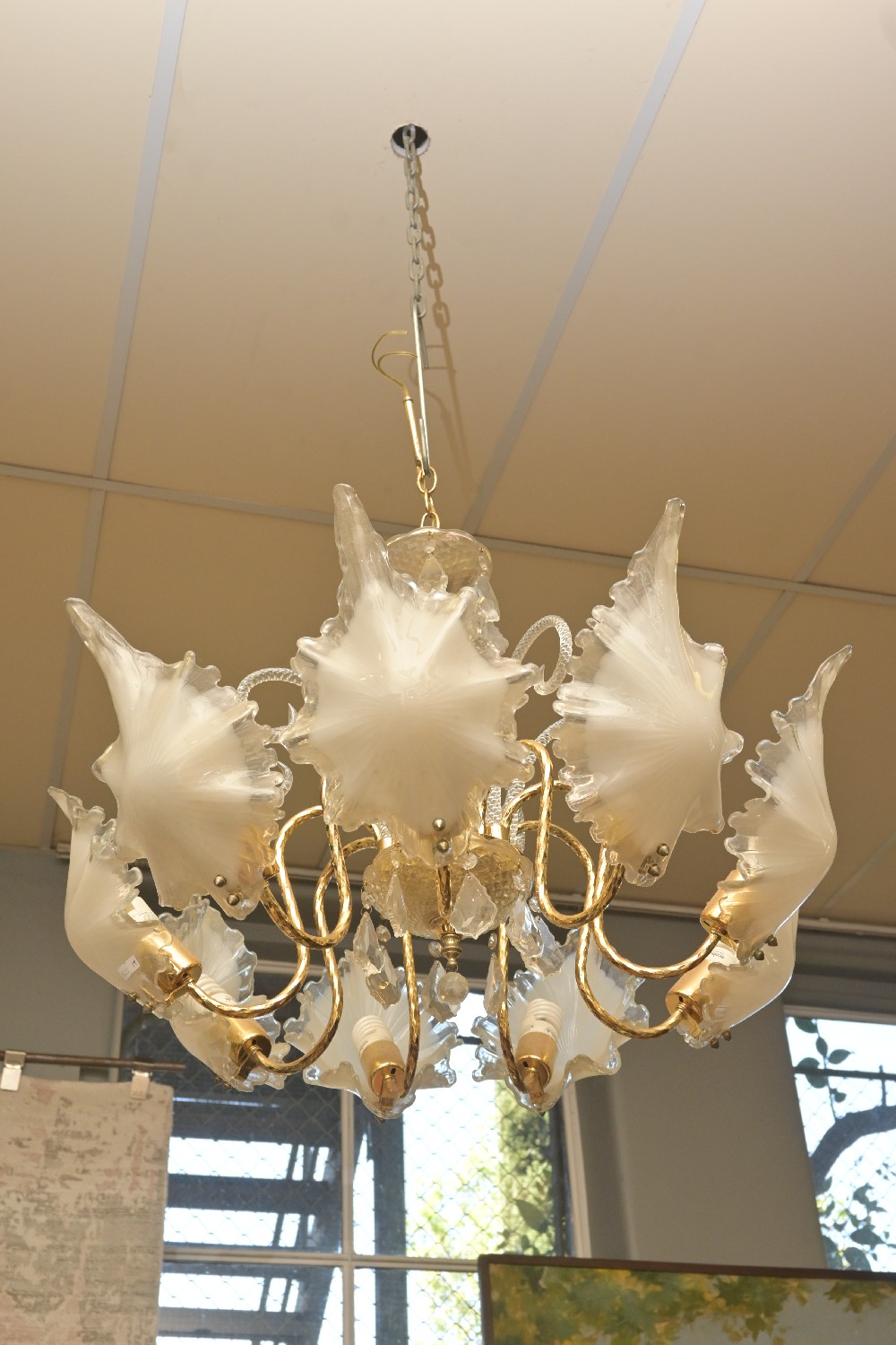 AN ART DECO STYLE BRASS AND GLASS NINE BRANCH CHANDELIER (50H X 57D CM) (PLEASE NOTE THIS HEAVY ITEM MUST BE REMOVED BY CARRIERS AT THE CUSTOMER'S EXPENSE. LEONARD JOEL STAFF CANNOT ASSIST CARRYING THIS ITEM) (X-LARGE ITEM)