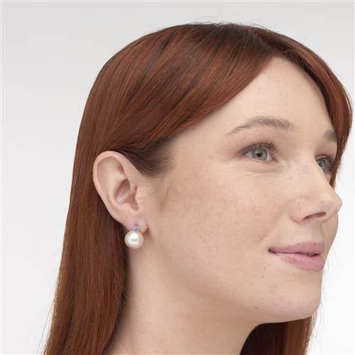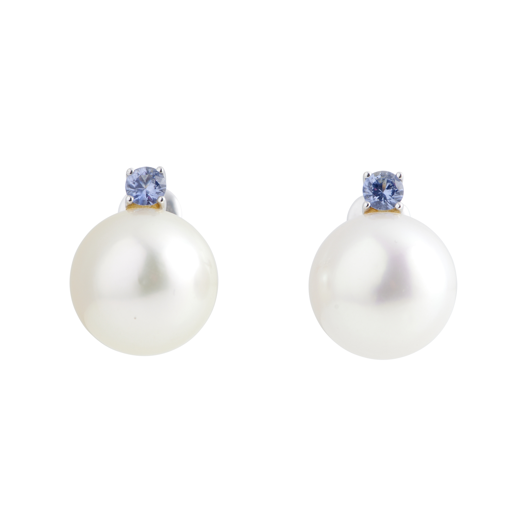 Each earring comprising a round pearl of white and cream hues measuring approximately 13.7mm, below a claw-set circular-cut sapphire, to post and butterfly fittings, length 17mm.