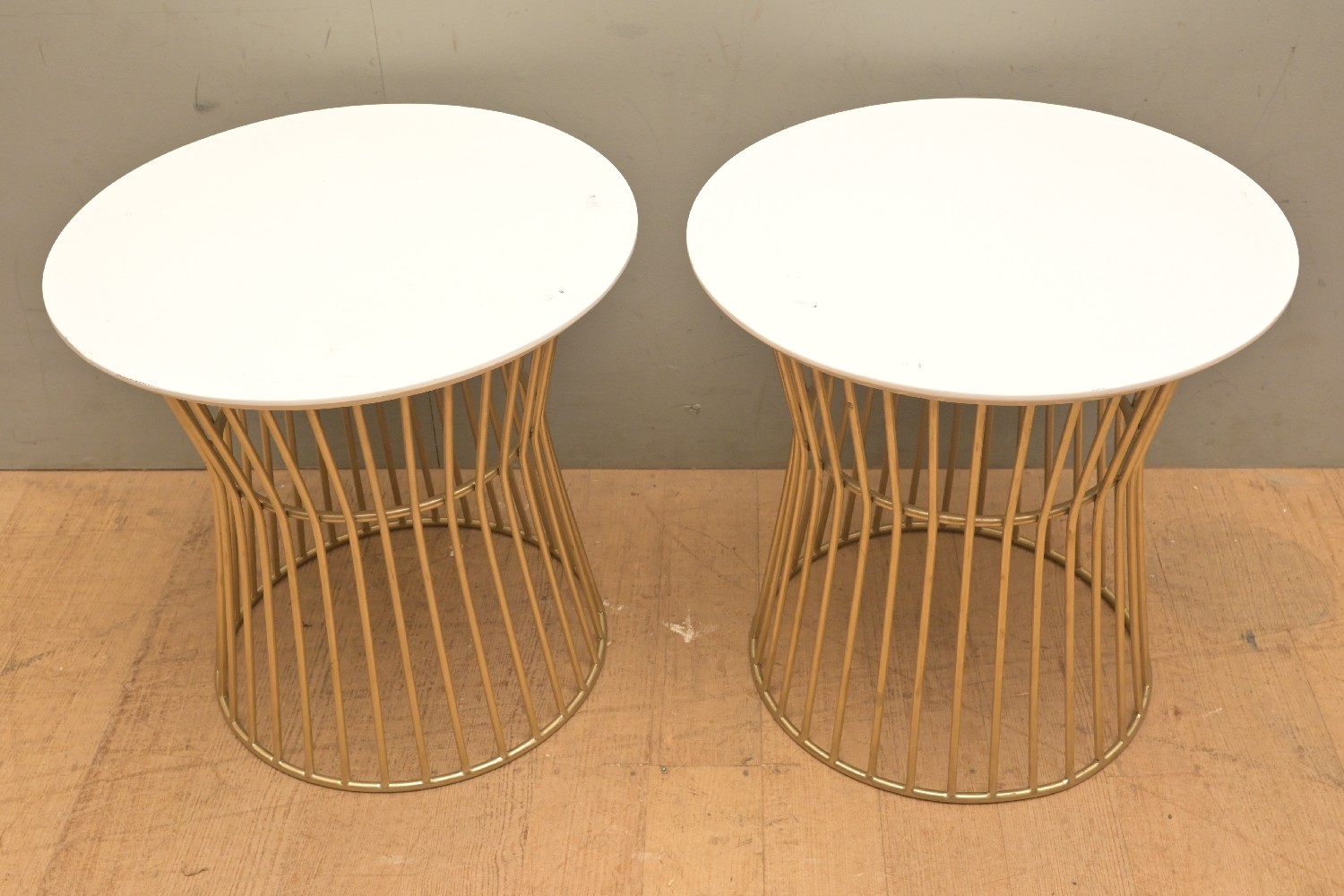 A PAIR OF DECORATIVE SIDE TABLES ON METAL BASE (A/F) (49H X 50D CM) (LEONARD JOEL DELIVERY SIZE: LARGE)